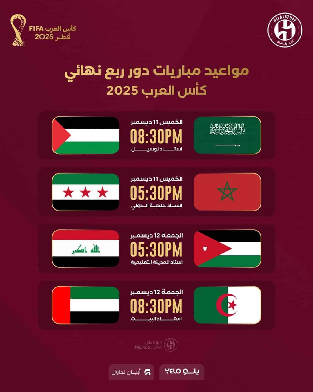 أنهت منافسات الدور الأول في كأس العرب قطر 2025 ستارها اليوم الثلاثاء، مع إكمال جميع مباريات المجموعات، لتؤهل ثمانية منتخبات إلى الدور ربع النهائي، بعد صراع شرس شهد مفاجآت وأداءً قوياً من الفرق العربية. المتأهلون هم: سوريا، فلسطين، المغرب، السعودية، الأردن، الجزائر، العراق، والإمارات، والتي أظهرت تماسكاً وطموحاً للذهاب أبعد في البطولة القارية التي تُقام لأول مرة بمشاركة 22 منتخباً.